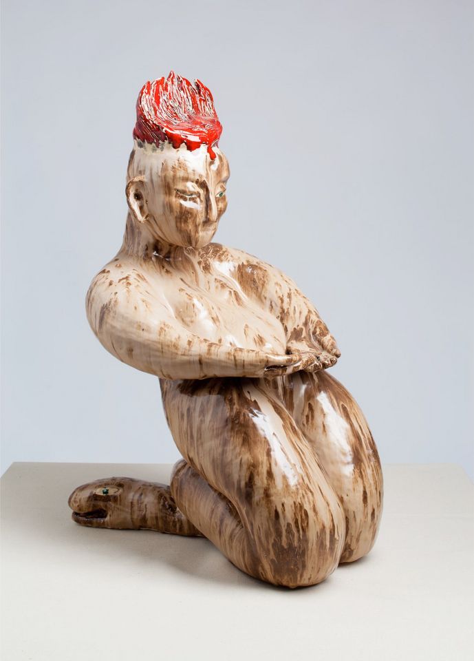 Die estnische Künstlerin Kris Lemsalu (*1985, Tallinn, Estland) ist Bildhauerin, Keramikerin und arbeitet in den Medien Installation und Performance. Nach einem Studium an der Estnischen Kunstakademie in Tallinn vervollständigte sie ihre Ausbildung an den Kunstschulen in Kopenhagen und Wien. In den letzten Jahren machte sie auf sich aufmerksam mit mehreren Performances wie jener anlässlich der Frieze in New York 2015, bei der sie, unter einem riesigen keramischen Schildkrötenpanzer liegend, mehr als drei Stunden lang ausharrte. Zu sehen waren nur ihre nackten Füße, Hände und ein Haarschopf, die einen provokanten Kontrast zur Schwere des Panzers der fiktiven Schildkröte bildeten, eine anschauliche Metapher der Verwandlung von Mensch zu Tier und vice versa. Die aufsehenerregende, öffentliche Vorführung war gleichsam als Manifest der Einsamkeit, Isolation und Verdrängung des Individuums innerhalb der heutigen Gesellschaft und speziell des Kunstbetriebs lesbar. In anderen Werken beschäftigt sich Kris Lemsalu mit Metamorphosen des Körpers und dessen biologischen und energetischen Prozessen, wobei sie ihren direkten psychischen und physischen Einsatz zum Kriterium ihrer Arbeit macht.