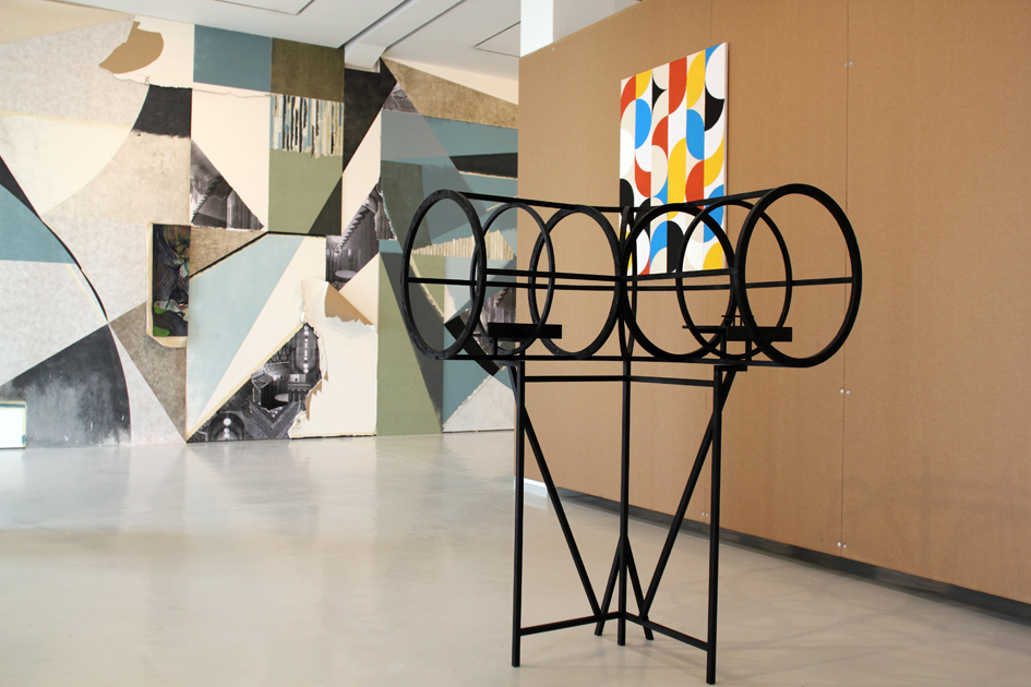 Auch Alexander Wolff zeigt in der Ausstellung eine wandfüllende Collage die zugleich Wandmalerei ist. Auf seinem Streifzug durch Düsseldorf und die Ausstellungsgeschichte von KAI 10 sammelte er Materialien und Bilder, die als Grundsubstanz seiner Arbeit dienen. Innenansichten aus der Düsseldorfer Kunstakademie und seines Hotelzimmers, Straßenstaub und gebrauchtes Baumaterial aus dem Ausstellungsraum, stellen einen Bezug her zu den materiellen und sozialen Parametern der vorgefundenen Situation. Dabei kommt in dem Wandbild, anders als in den Gemälden des Künstlers, kein vorformuliert Entwurf zur Ausführung. Vielmehr beruht die visuelle Opulenz des Werks auf einem assoziativen und konstruktiven Vorgehen, aus dem sich das Bild intuitiv und spielerisch entwickelt.