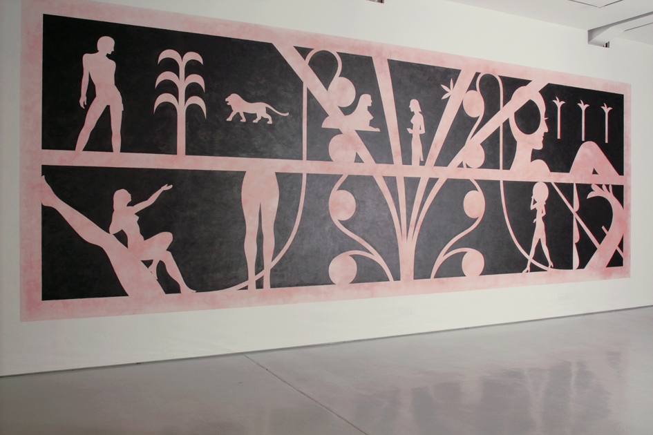 Berthold Reiß nutzt in seiner Wandarbeit die Rhetorik öffentlicher Bildsysteme und verbindet sie in der Ausstellung mit Skulpturen und Aquarellen. Das aus Graphit und Acrylfarbe gestaltete Wandbild zeigt florale Motive sowie Grundformen des Schattenrisses, die gleichermaßen das bildhaft-ornamentale Erzählen antiker Kunst, die abstrahierenden Arabesken Philipp Otto Runges als auch heute allgegenwärtige Formen des Piktogramms aufgreifen. Die vom Künstler genutzten Bildzeichen stehen jedoch nicht für einen historischen Zusammenhang, sondern er versteht sie als zeitlose Formen, in die sich jede Zeit immer wieder neu und subjektiv einschreiben kann. Die Gegenwärtigkeit seines Entwurfs drückt sich denn auch in der Vergänglichkeit des temporär für die Ausstellung geschaffenen, monumentalen Wandbildes aus.
