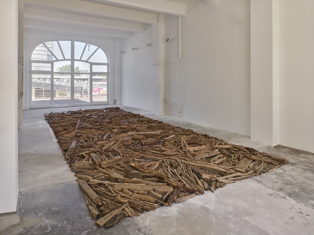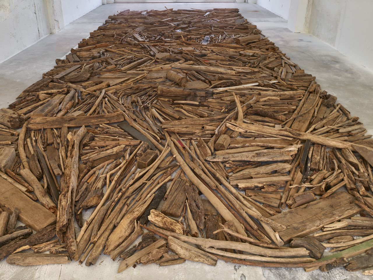 Die rund 40 qm große Bodenarbeit entstand 2001 im Rahmen einer Ausstellung im Museum Kurhaus Kleve. Long sammelte hierfür Treibholz, das im letzten deutschen Rheinkilometer vor der niederländischen Grenze angeschwemmt wurde – ein direktes Zeugnis seiner prozesshaften, ortsbezogenen Arbeitsweise. Die geometrisch angelegte Installation variiert in ihren Maßen und folgt einer von Long vorgegebenen formalen Ordnung. Zuletzt war das Werk 2013 im Museum DKM in Duisburg ausgestellt – jenem Ort, an dem Long bereits 1996 mit dem renommierten Wilhelm-Lehmbruck-Preis ausgezeichnet wurde.